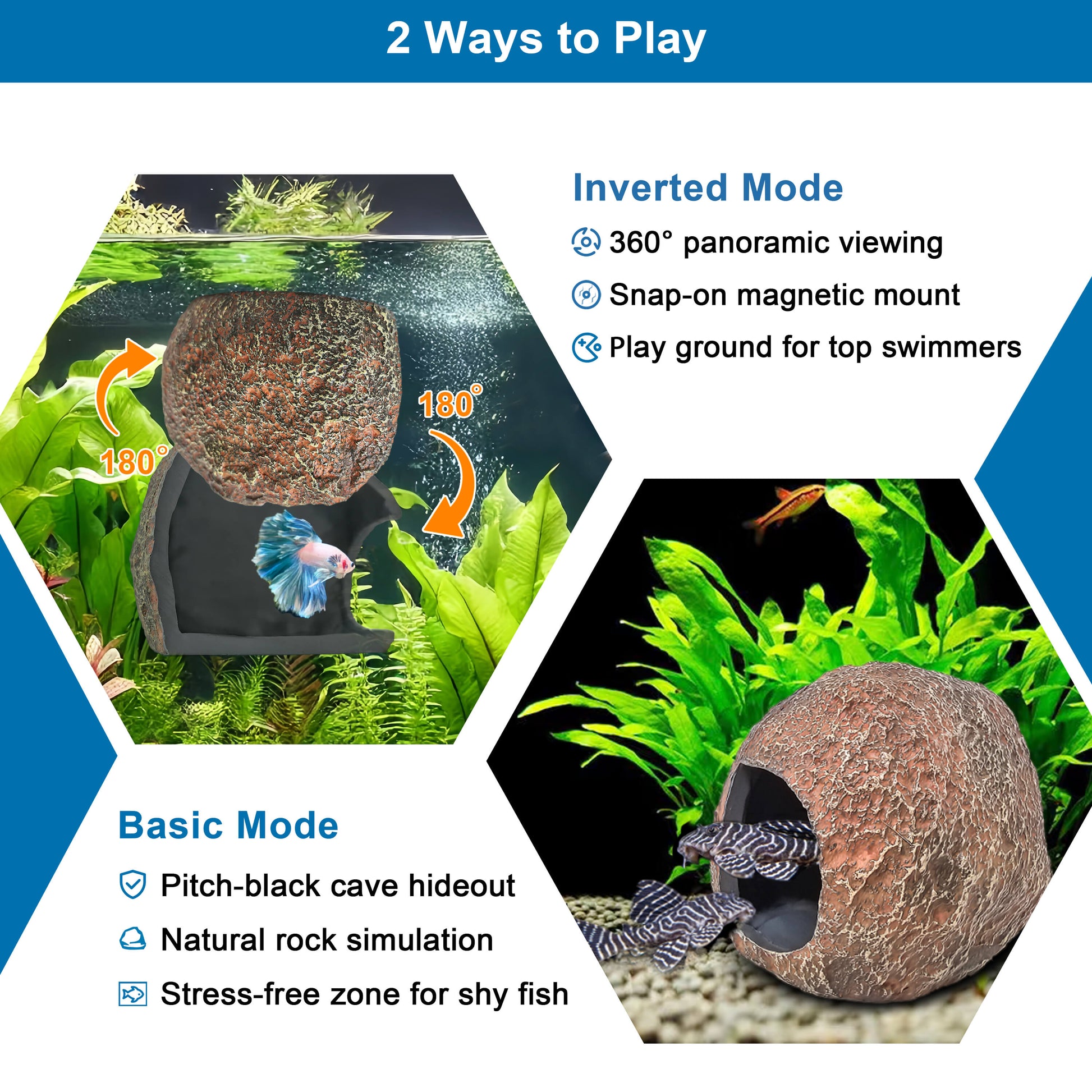 Versatile Placement Options: Multiple mounting modes—bottom, middle or top—accommodate small species like plecos, cichlid, bettas and clownfish. Acts as a pleco cave for bottom dwellers or a betta fish hideout near the surface, enriching any fish tank decor.