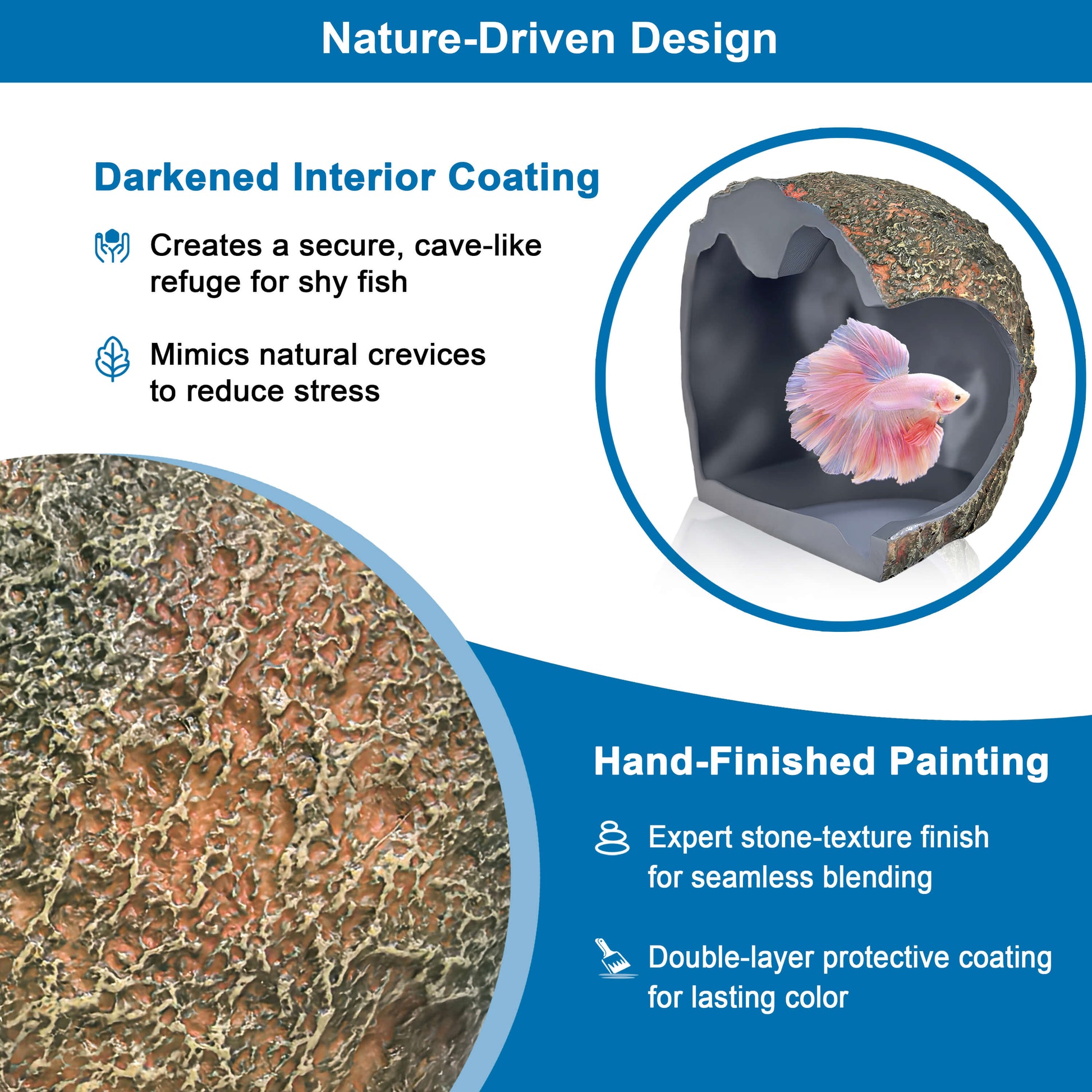 Premium Resin Construction: Crafted from premium resin with a hand‑painted stone‑like finish to blend seamlessly into your fish tank decor. Its dark interior mimics a hidden cave, providing an ideal aquarium cave retreat for shy or reclusive species.