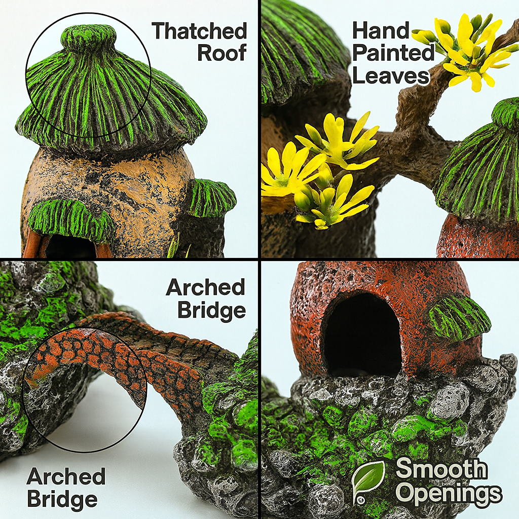 Multiple Hideouts & Swim: Throughs: Doorways, windows and a flow-through bridge form cozy fish caves / hideouts for bettas, shrimp and fry, reducing stress and encouraging natural behavior.